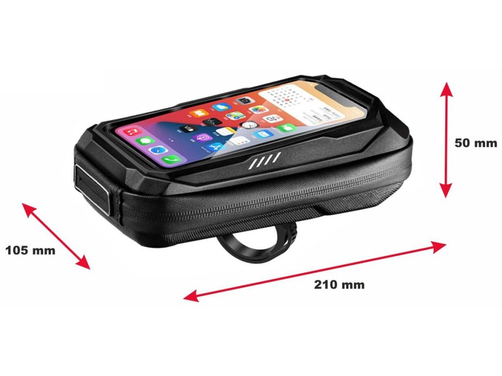 Pouzdro je vybaveno průhlednou slídou, která umožňuje snadné sledování displeje smartphonu. Smartphone se připevňuje uvnitř pouzdra pomocí suchého zipu, což zajišťuje jeho stabilitu. Díky průhledné slídě je možné smartphone pohodlně ovládat, což je ideální například při používání navigace během jízdy.